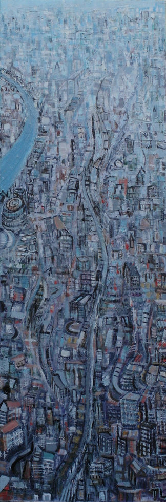 These paintings are reflections on and about London. They are impressionistic interpretations from an aerial view. Having lived in London for many years, I find that this city offers fantastic views. I like to contemplate buildings, bridges and the Thames, as well as the light and movement of such an urban environment.